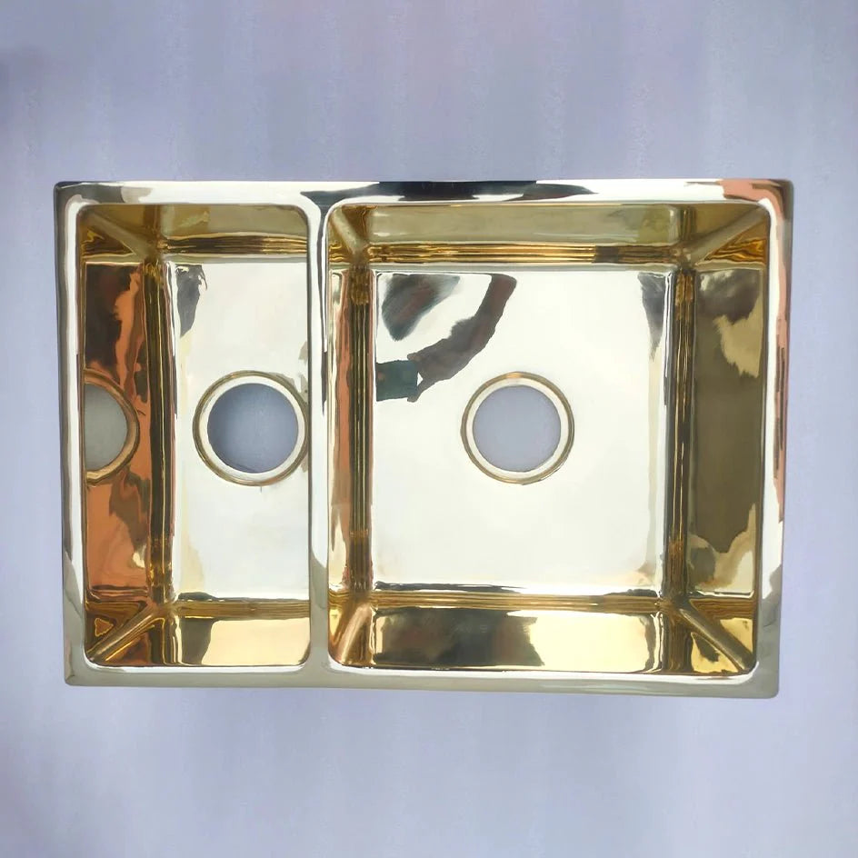 This unlacquered brass sink offers the perfect combination of functionality and versatility, serving as both a prep and clean workstation with its integrated ledge and dual bowls. The larger bowl is positioned on the right partition, while the smaller bowl is on the left partition. This setup allows for a convenient wash and rinses arrangement between the two basins.